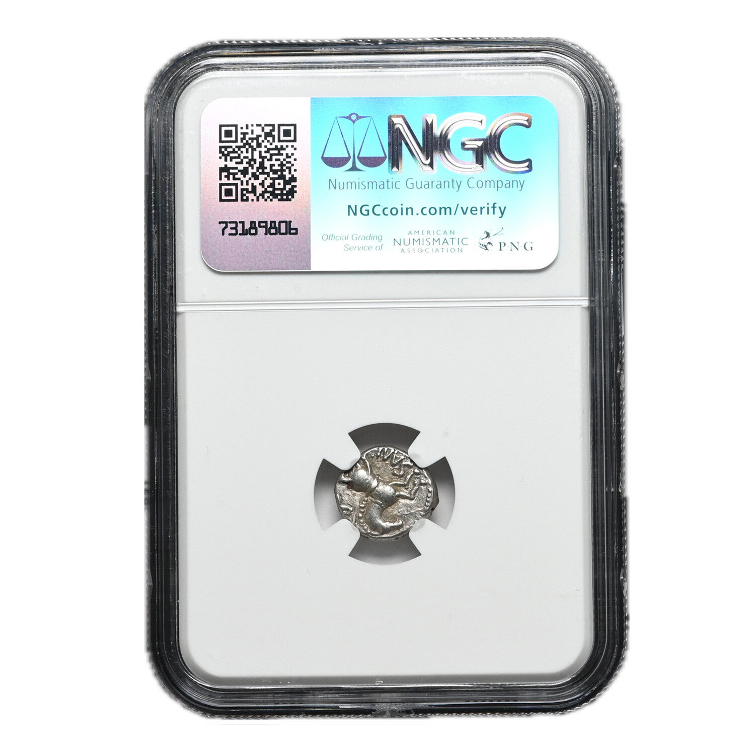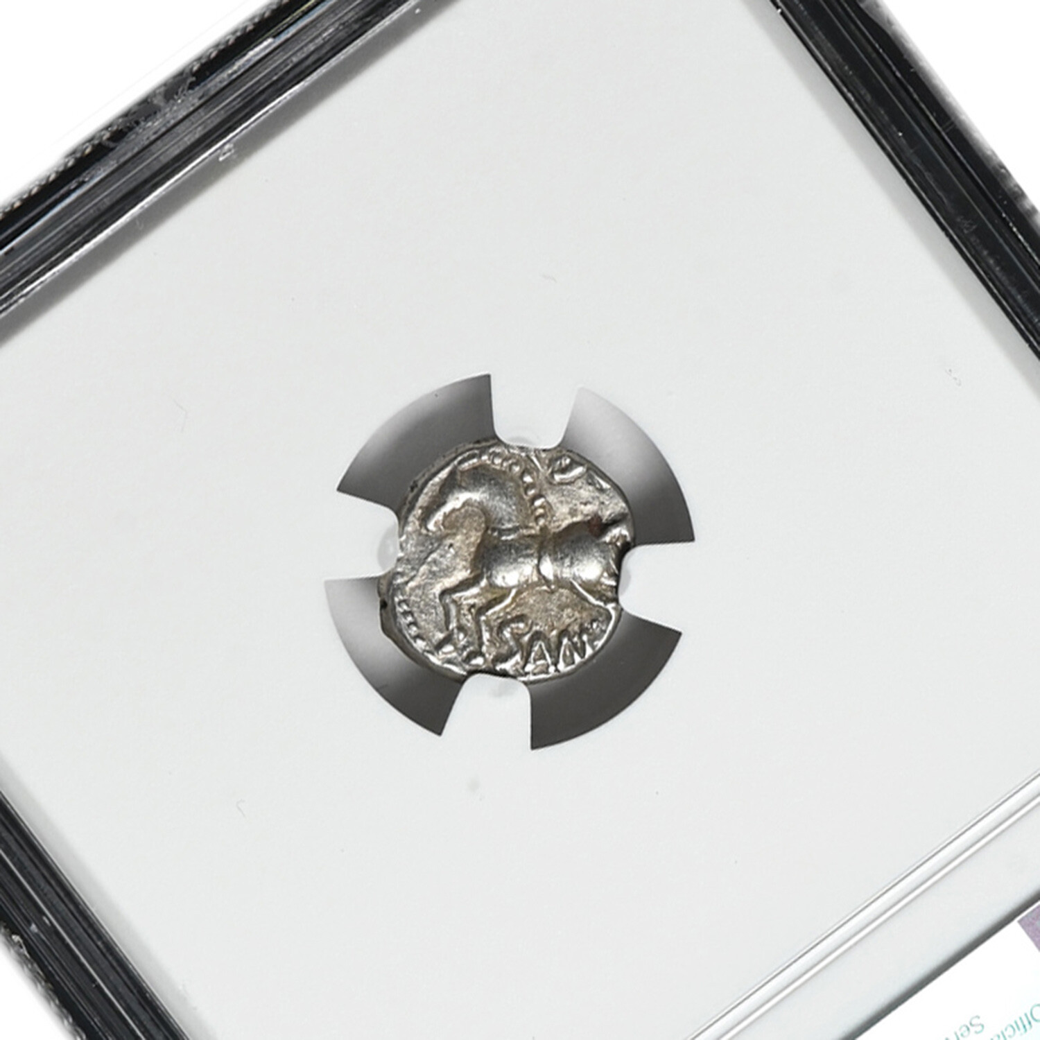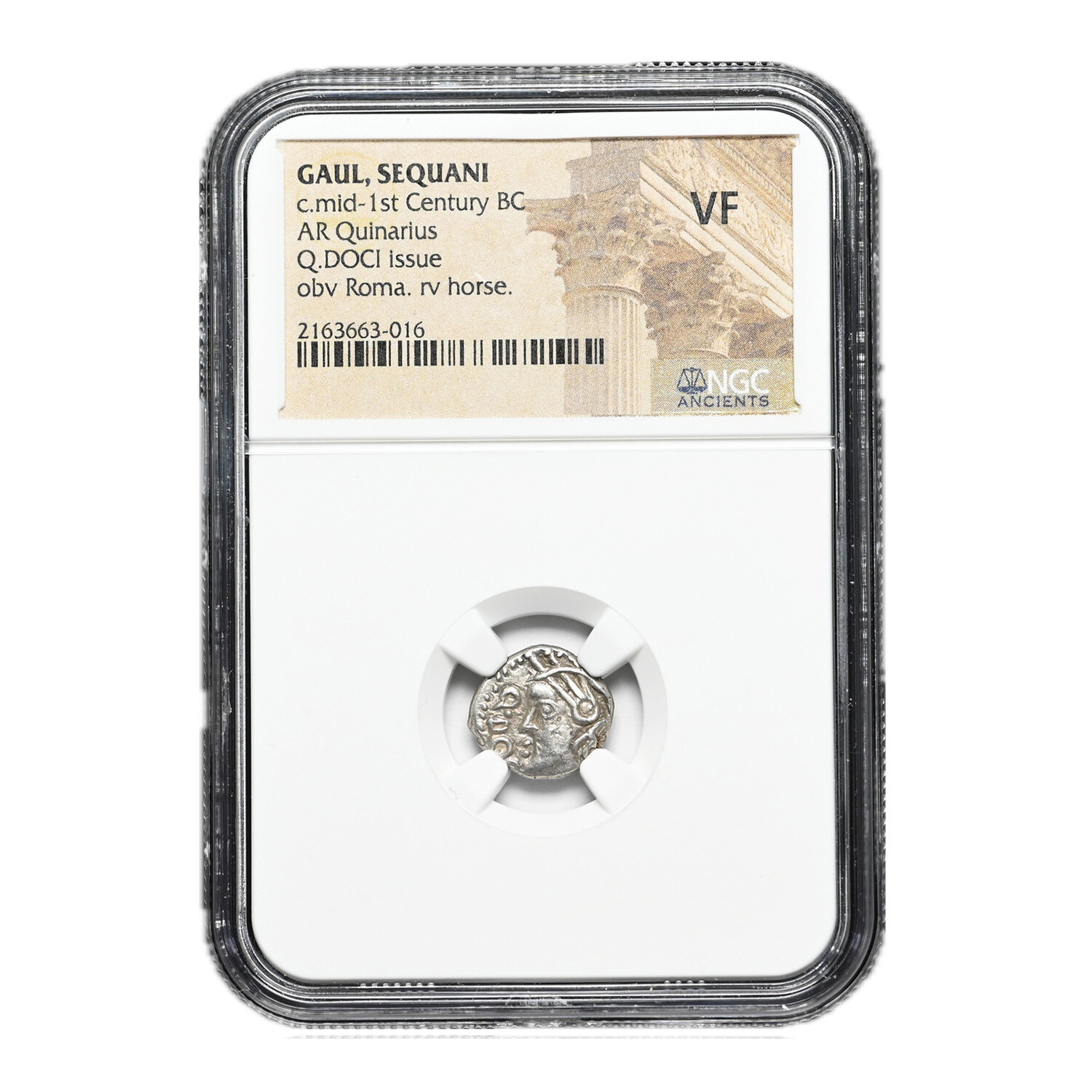 Ancient Celtic Gaul. Mid 1st Century BC. Silver Quinarius struck by the Sequani tribe near Besançon. The front depicts a helmeted Celtic head facing left; inscription Q.DOCI to the left / The back shows a horse racing left with legend SAM.F around. Coin reference: Delestrée 3245 for type. Excellent detail for this scarce tribal issue. Coin measures 13mm in diameter; encapsulated and graded Very Fine by NGC. Archival slab size: 3.125" x 2.125" x 0.375”. Provenance: Ex De Père, WI collection. *** Issued during the turbulent years of Roman expansion into Gaul, these coins reflect the distinct cultural and artistic identity of the Celtic tribes, and are rarely preserved with this level of detail.