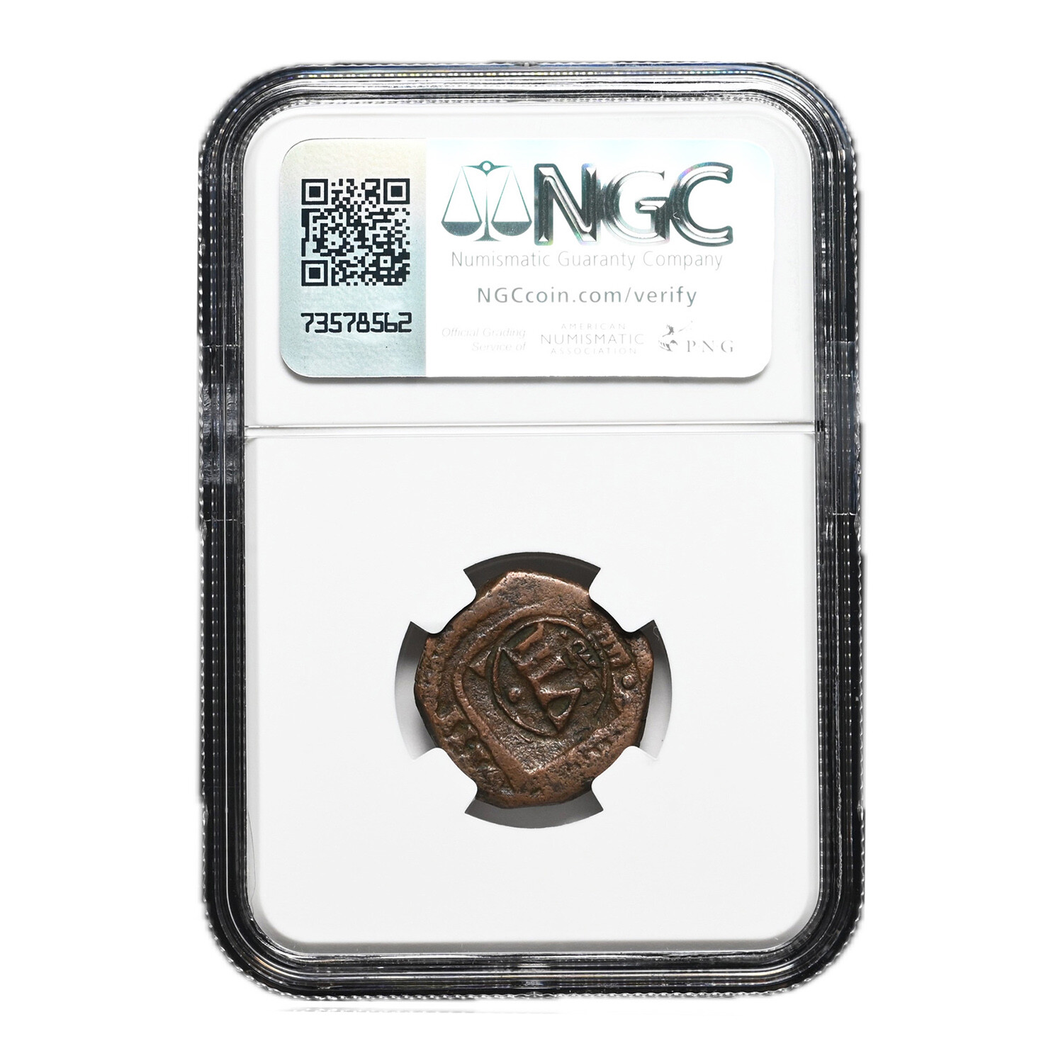 Spanish Copper "Pirate" Money. Philip IV of Spain, 1621–1665 AD. 8-Maravedis Coin Revalued in 1641. Originally struck with a lion on one side and a castle on the other, this copper 8-maravedis was counterstamped during a monetary revaluation in 1641—now bearing a large “1641” on one side and Roman numeral “VIII” on the other. Deep coppery tone with sharp detail. Encapsulated and graded Fine Details by NGC. Coin measures 21mm in diameter; archival slab measures 3.125" x 2.125" x 0.375”. Provenance: Ex De Père, WI collection. *** These rugged coins circulated widely in Spain’s colonies and aboard ships during the age of pirates and privateers, making them a true piece of maritime and colonial history.