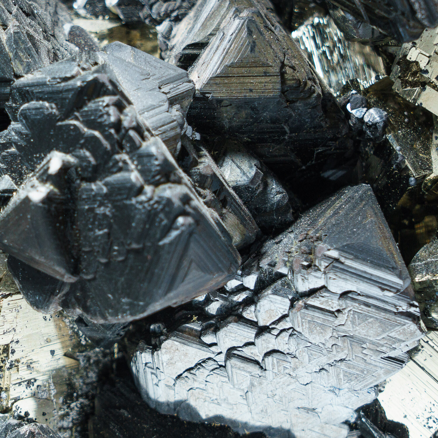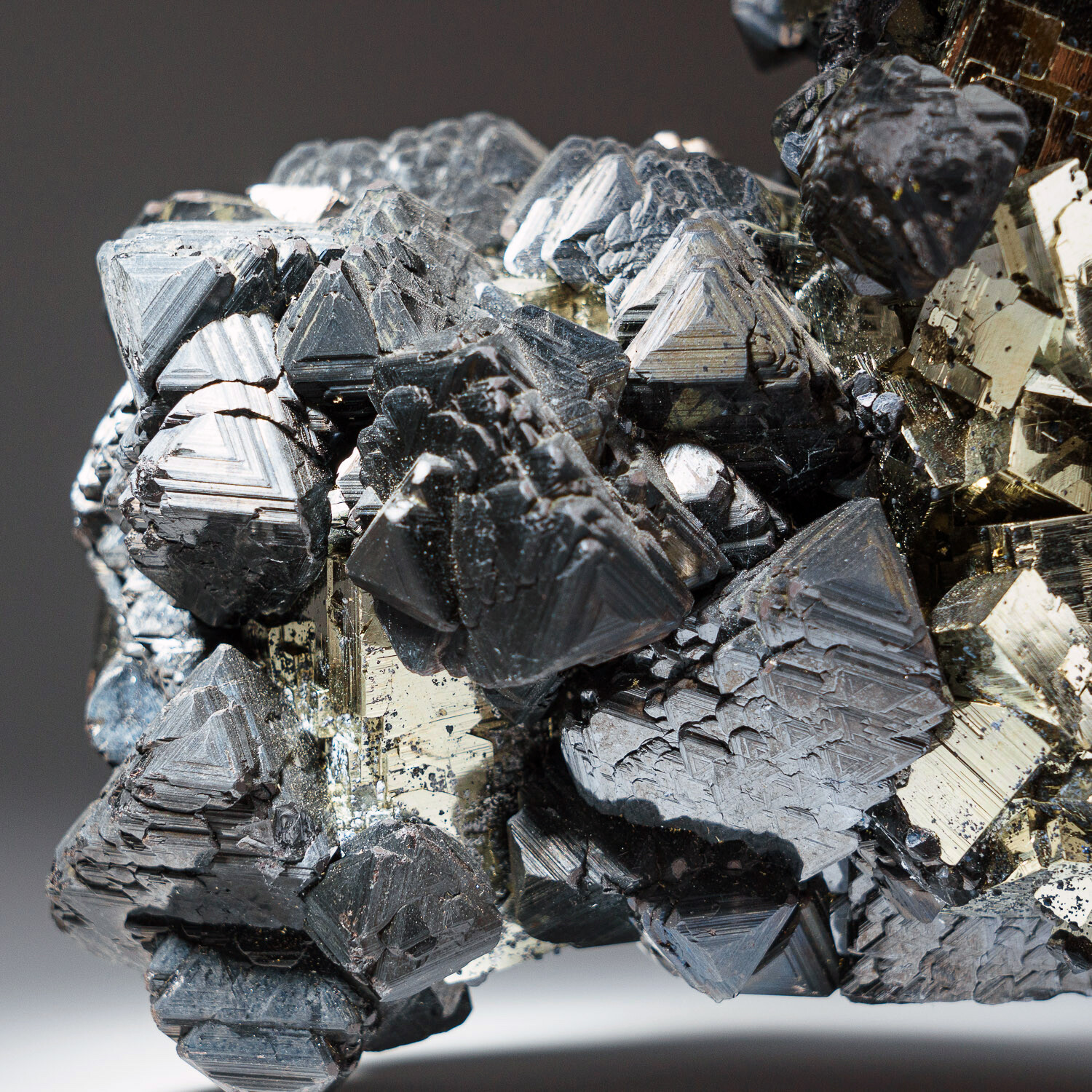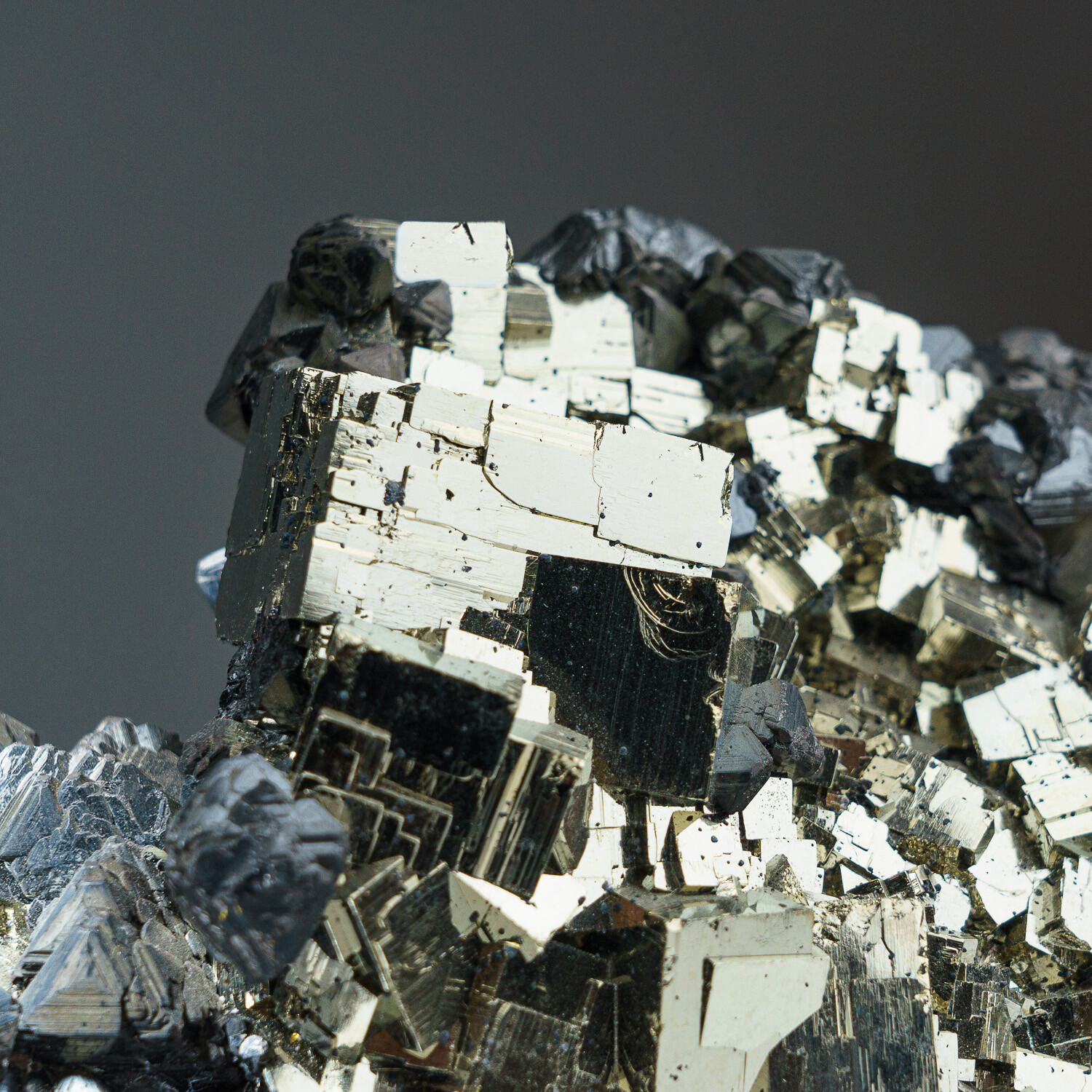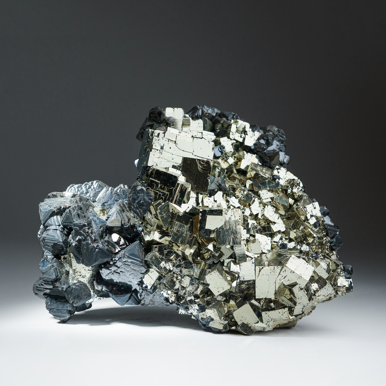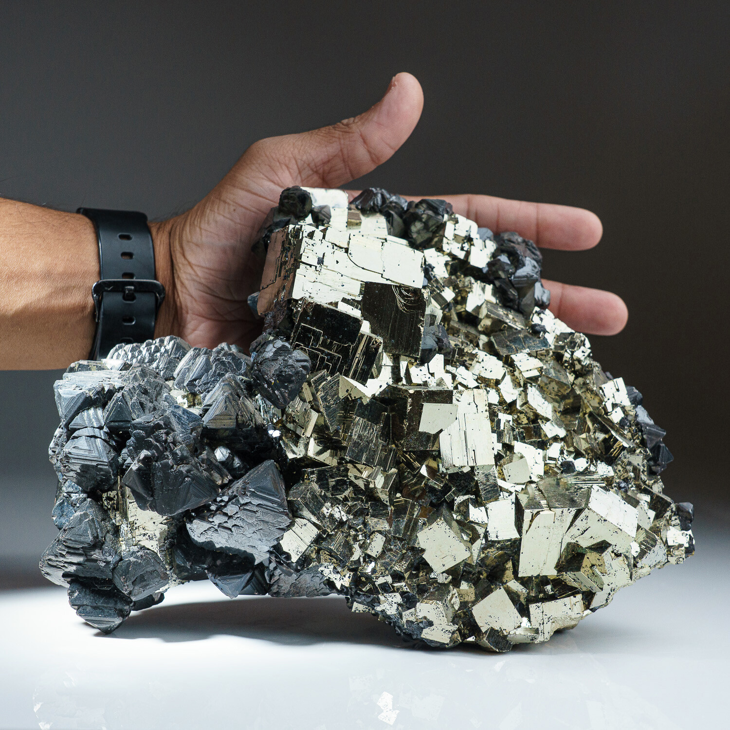 Large Pyrite and Sphalerite specimen from Casapalca District, Huarochiri Province, Peru featuring lustrous, striated cubic yellow-metallic Pyrite crystals intergrown with striking black-metallic Sphalerite crystals. This substantial piece showcases bold contrast and impressive natural geometry.