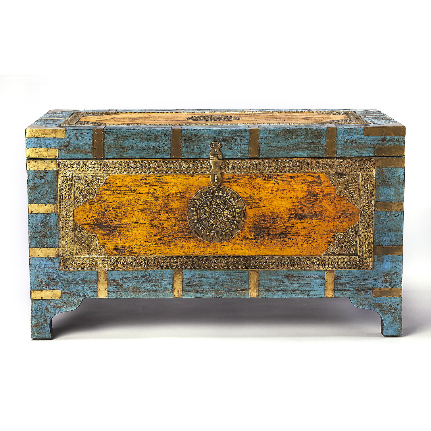 Intricately designed with brass inlays and blue and gold hand painting, this unique storage trunk has a vintage feel. Handcrafted from mango wood solids, it has a hinged lid that opens for spacious interior storage.
