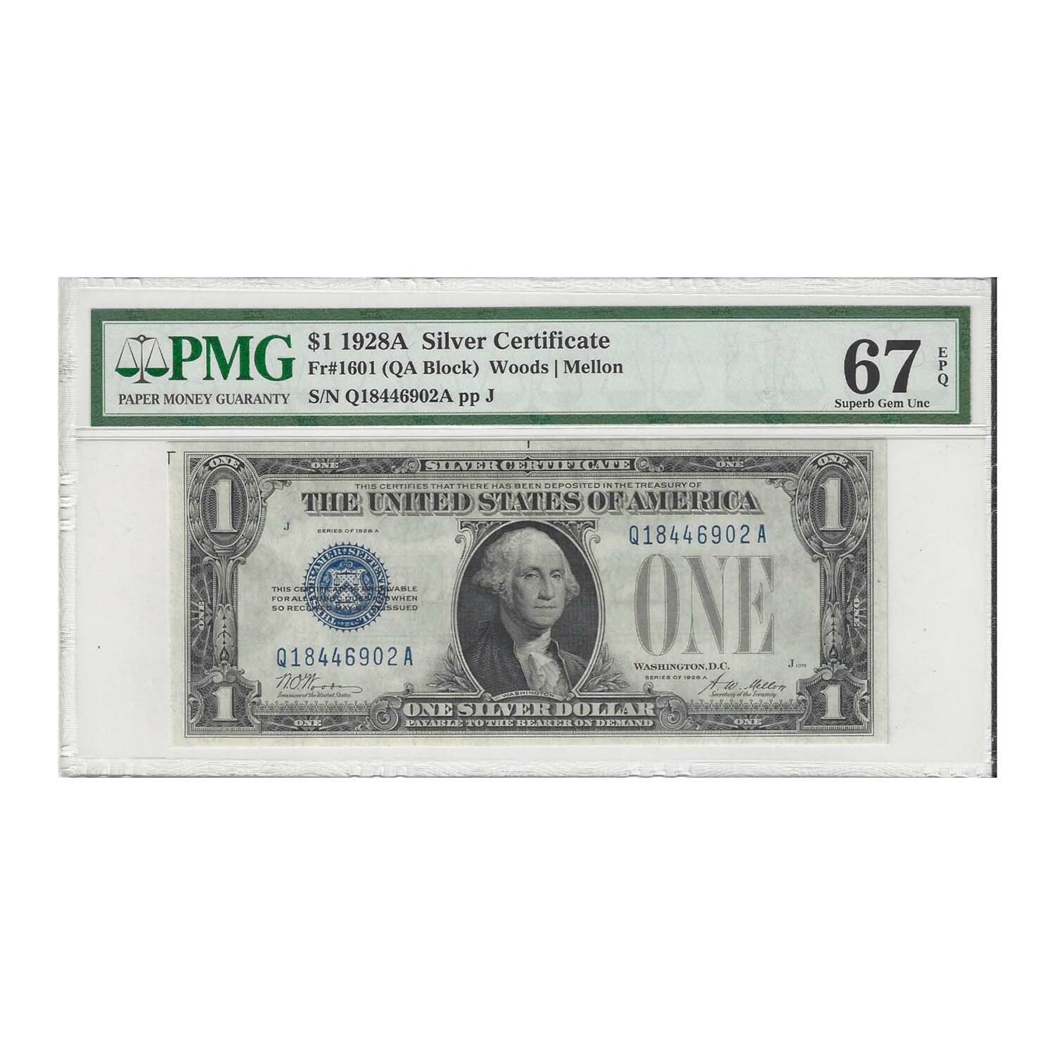 Being offered today is an EXTREMLY RARE, SUPER HIGH GRADE, TOP OF THE POP 1928 A $ 1 Silver Certificate note. The note is graded by PMG in 67 Superb Gem Uncirculated Exceptional Paper Quality (EPQ)!