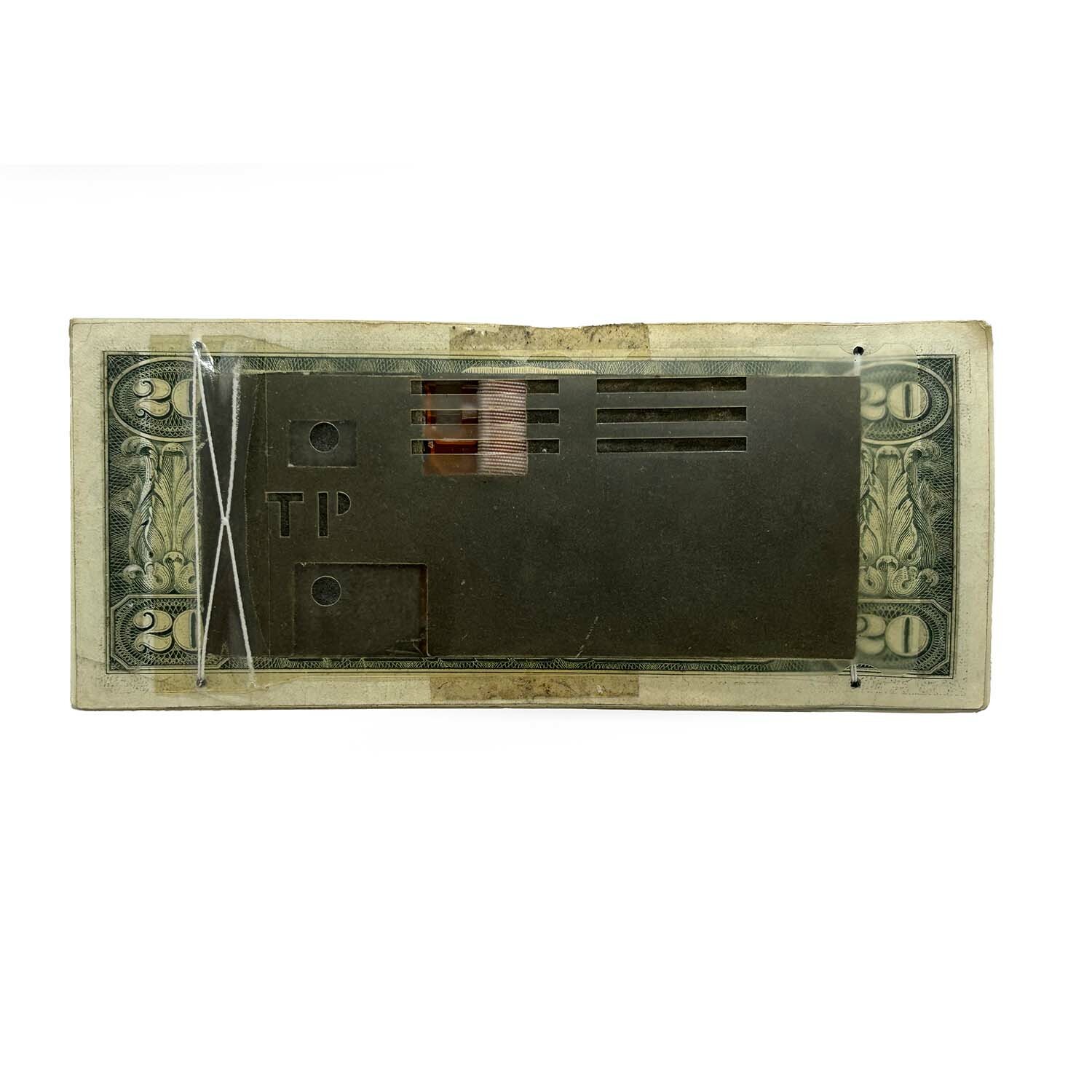 This is a Rare original $ 20 Federal Reserve decommissioned EXPLODING DIE PACK/CASH TRACKER that the U.S. Bureau of Engraving used to track pallets of money while it is in transit from Fed to Fed, or to a banking institution.