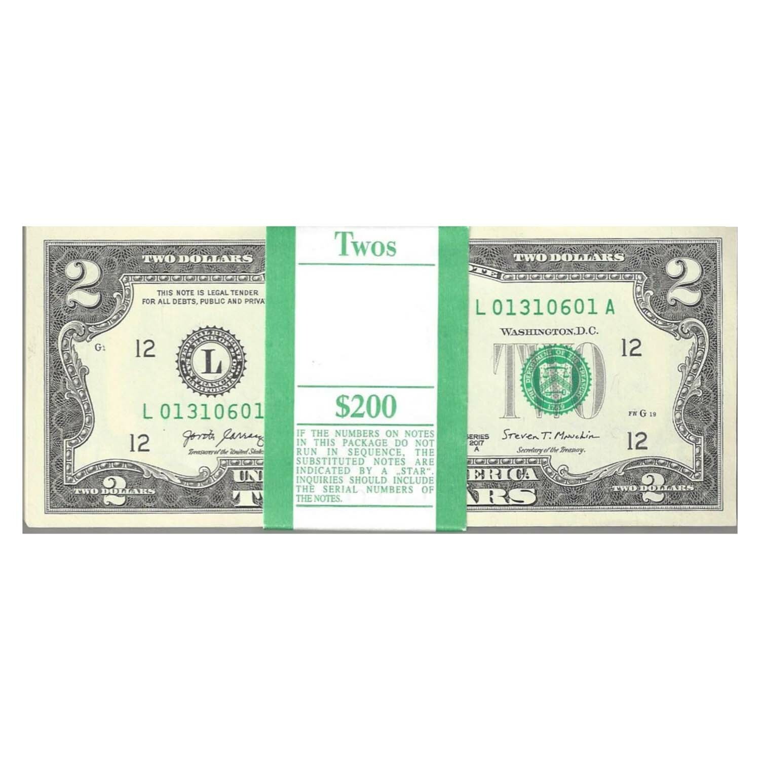 Being offered today is a beautiful fresh 2017 A $2 pack of Federal Reserve notes. This GEM CHOICE UNCIRCULATED PACK. The pack has 100 consecutive notes!