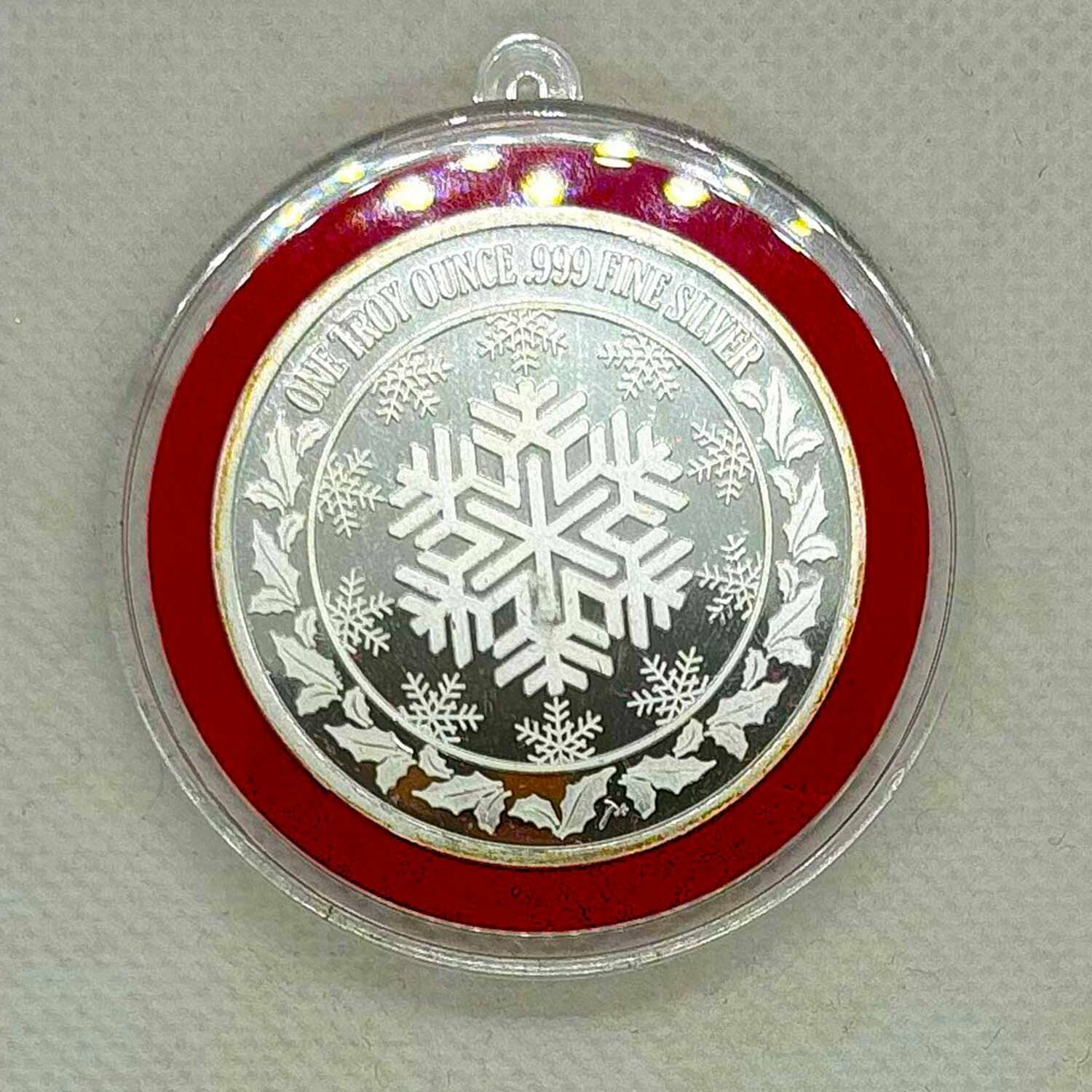 Snowflakes are featured in the reverse design. The design field has a single, large snowflake in the center with several snowflakes falling through the background field. There is holly around the border with inscriptions of ONE TROY OUNCE .999 FINE SILVER.