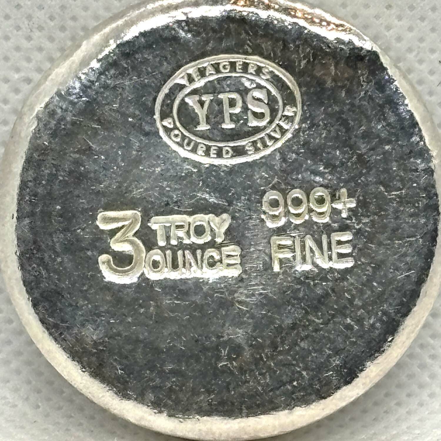 The back of the coin has the YPS ( Yeager's Poured Silver) logo, along with the metal weight (3 TROY OUNCE ), and silver purity ( 999+ FINE ).