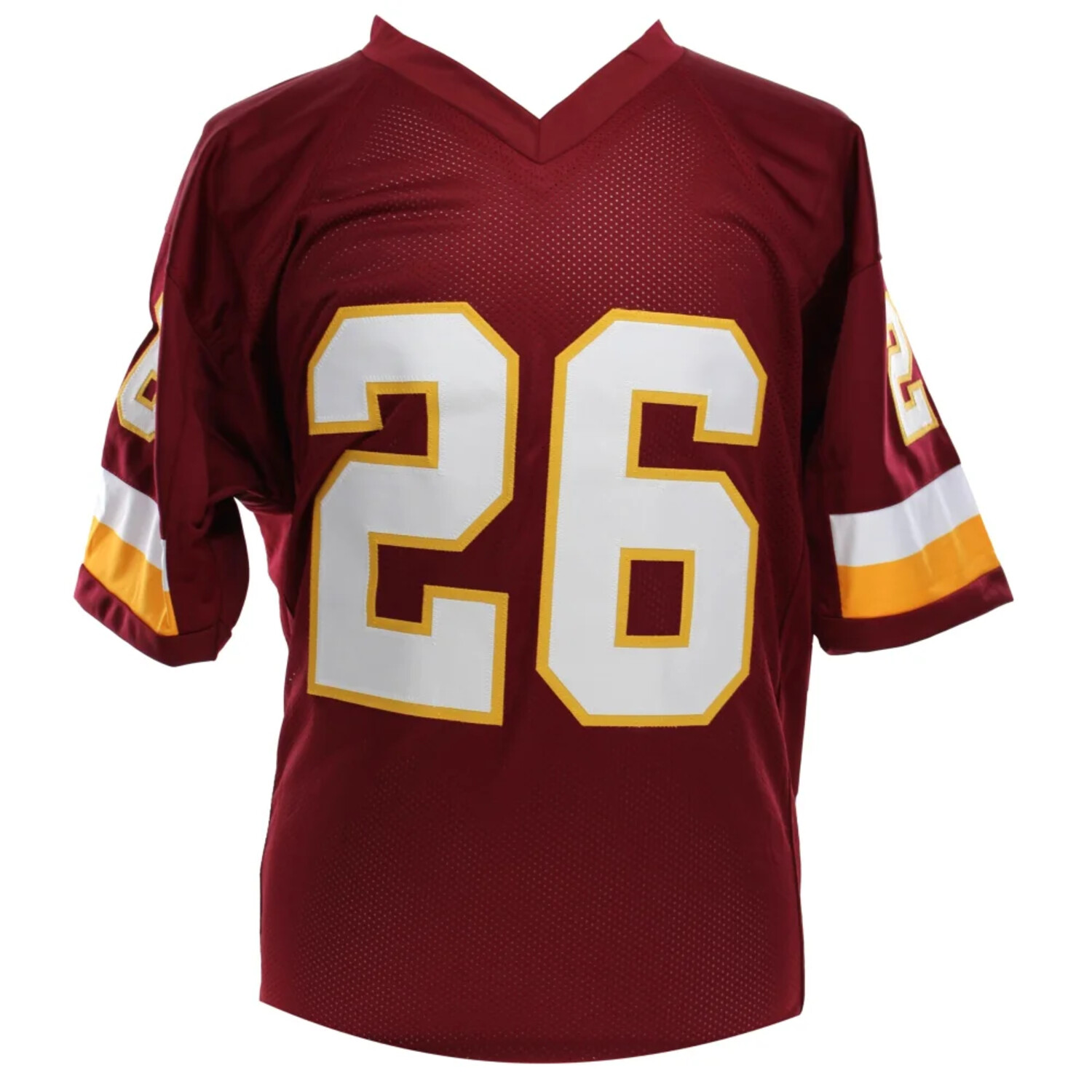 This is a custom-made, burgundy, size XL jersey styled after the classic Washington Commanders (Redskins) home uniform. It features no official team or league logos, giving it a clean and timeless design ideal for display. The bold gold and white stitched numbers contrast beautifully against the deep burgundy fabric, creating a strong backdrop for Portis’s signature.