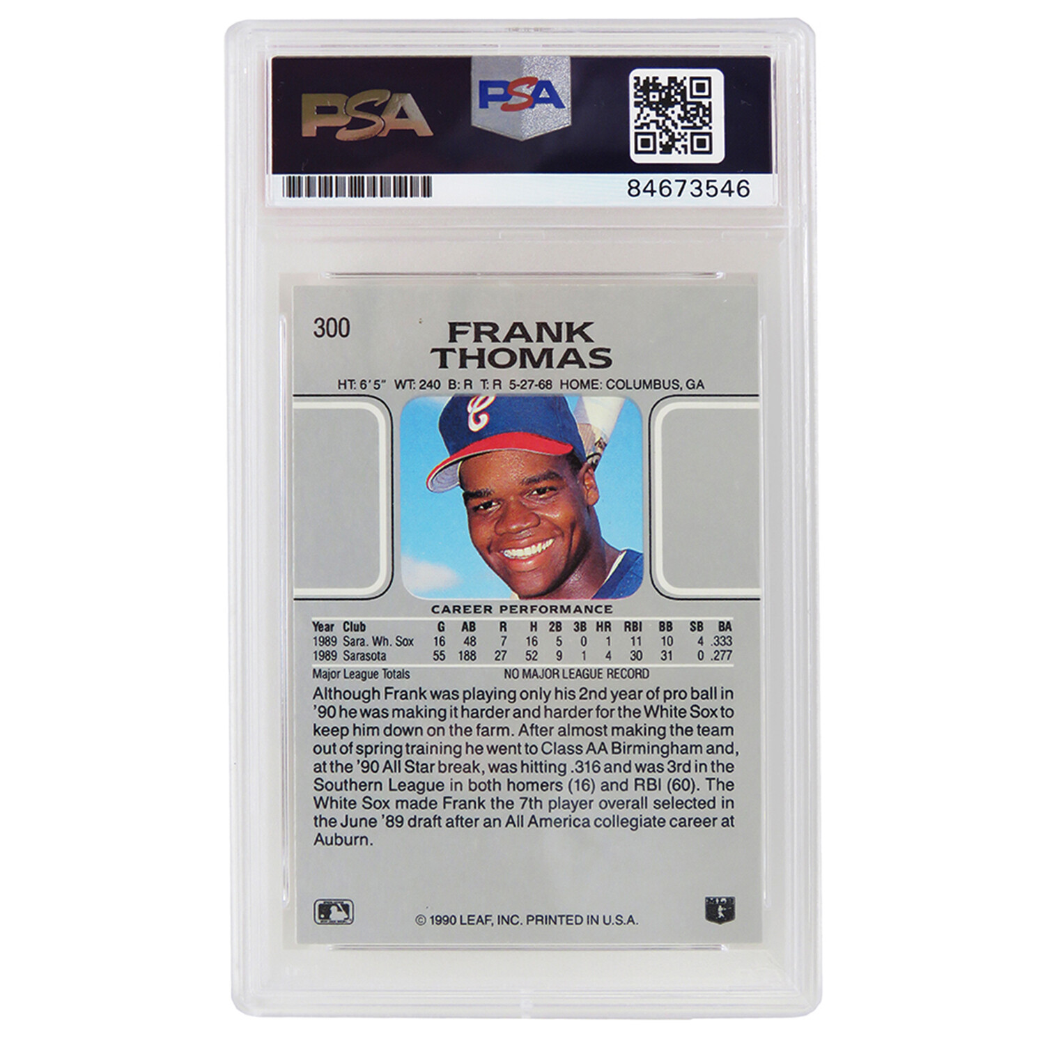 Add a Hall of Fame signature to your collection with this Frank Thomas autographed 1990 Leaf #300 rookie card, featuring a GEM Mint 10 auto grade from PSA. Encapsulated for authenticity and protection, this iconic White Sox rookie card showcases a bold, clean signature from one of baseball’s greatest sluggers.
