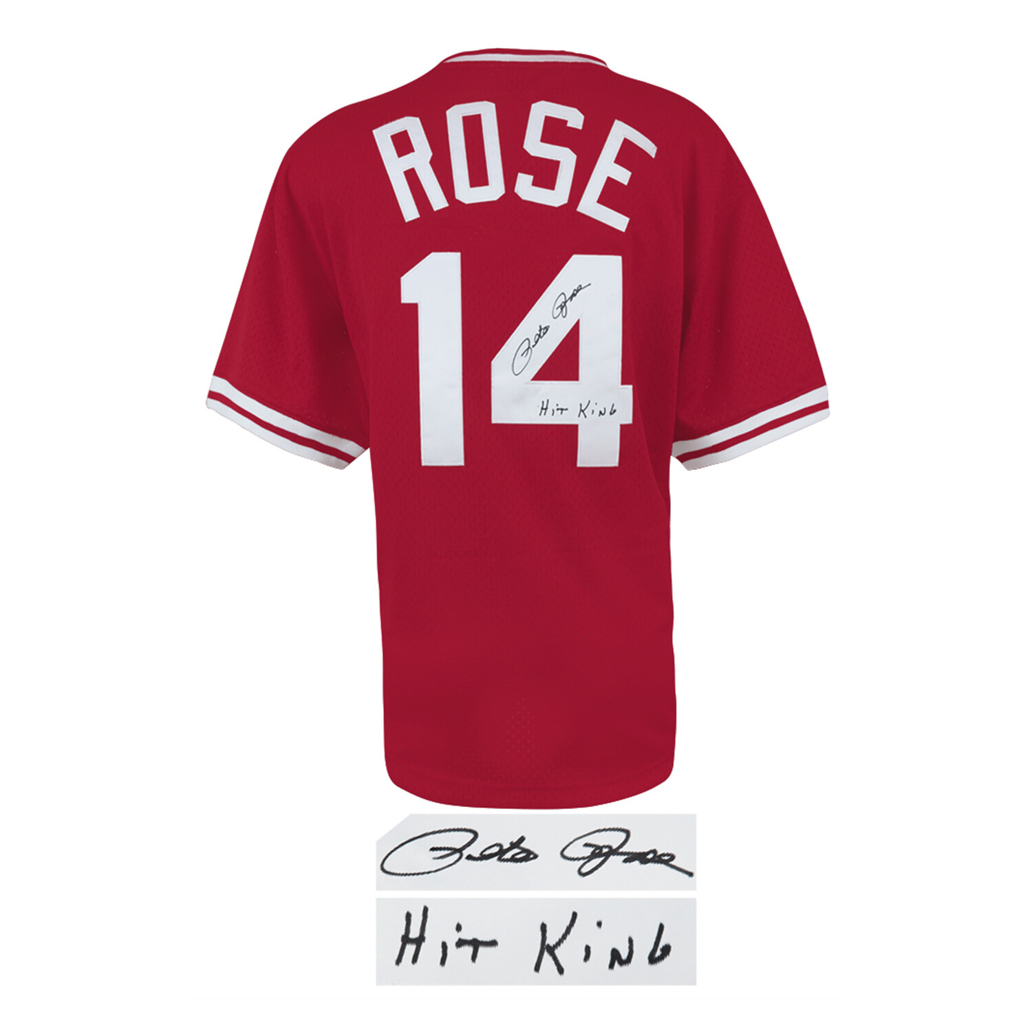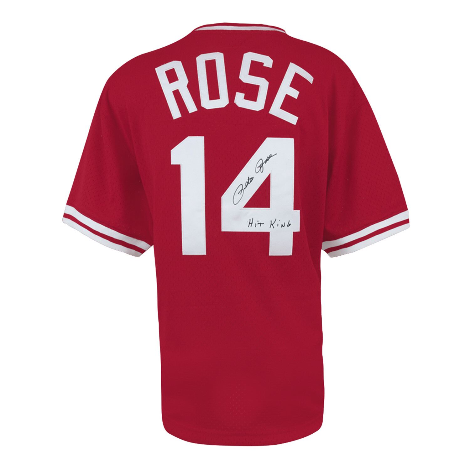 Honor one of the most relentless hitters in baseball history with this Pete Rose autographed Cincinnati Reds Mitchell & Ness throwback jersey, styled after the team’s 1984 batting practice look. Featuring the iconic “Hit King” inscription, this bold red jersey is a standout tribute to MLB’s all-time hit leader.
