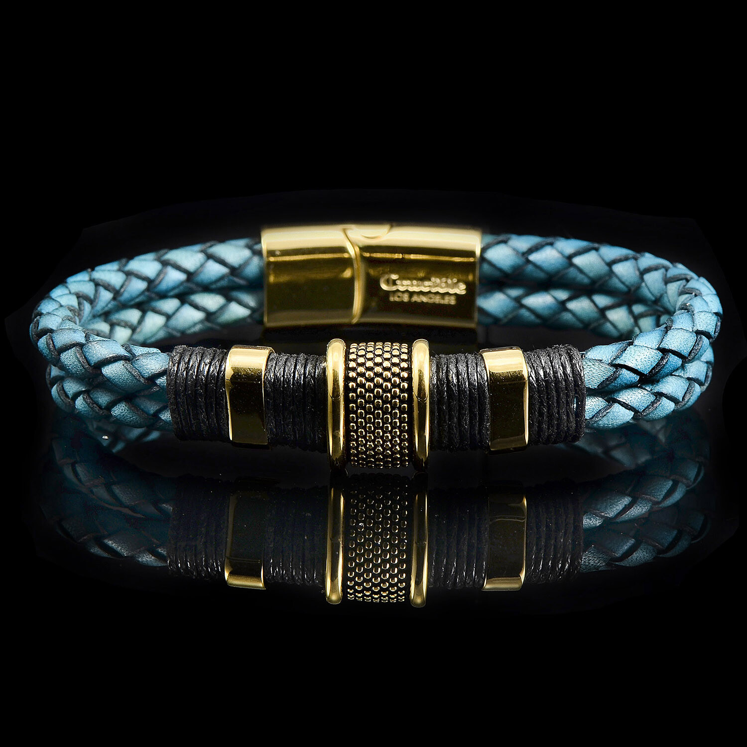 Gold Plated Stainless Steel Distressed Aqua Blue Leather Cuff Bracelet // 8.5"