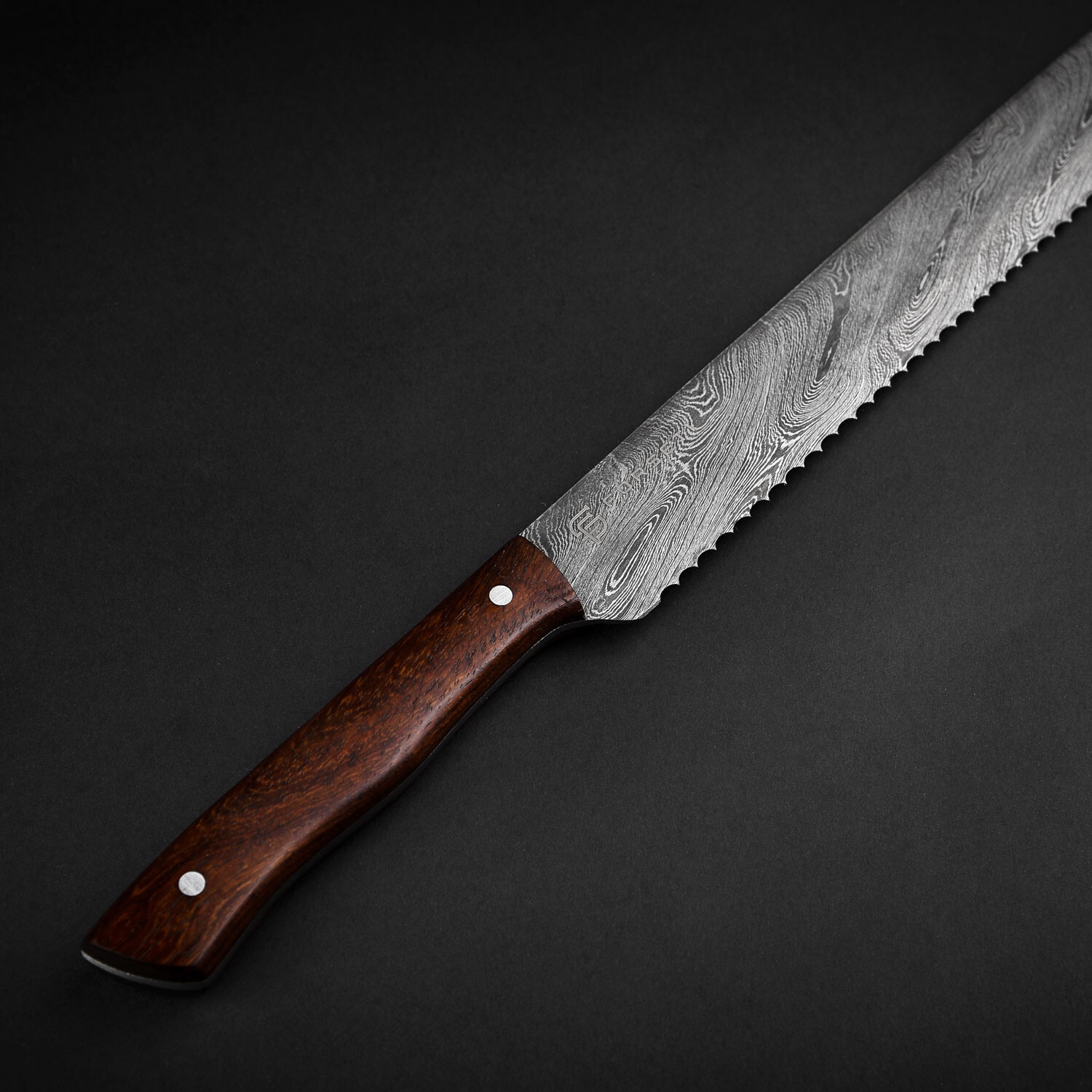 The Kodiak chef knife is the work horse of this set and is ideal for slicing, chopping, and cutting. The petty/utility knife is ideal for those small kitchen duties, such as paring, peeling and chopping herbs. The meat slicing and carving knife makes short work of large cuts of meat. Whether that is a delicious smoked brisket, thin tri-tip or a large roast, the 10" blade will make slicing through these large cuts of meat a breeze. The 10" serrated bread knife rounds out this beautiful set of knives and will slice through the most hardy of breads or a delicate croissant.