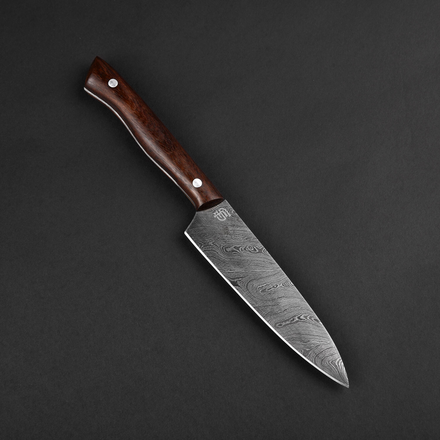 Please note: Each knife is handmade from natural materials and may vary slightly in color, Damascus pattern, and overall look. Damascus steel can rust if not cared for properly. Do not keep Damascus steel in a leather sheath for long periods of time, as the leather can cause the steel to rust. Please be aware Damascus steel products will arrive fully coated in a protective, non-toxic mineral oil, which can be easily washed off before use. Damascus steel should be regularly oiled with any household oil over the course of its life to prevent corrosion.