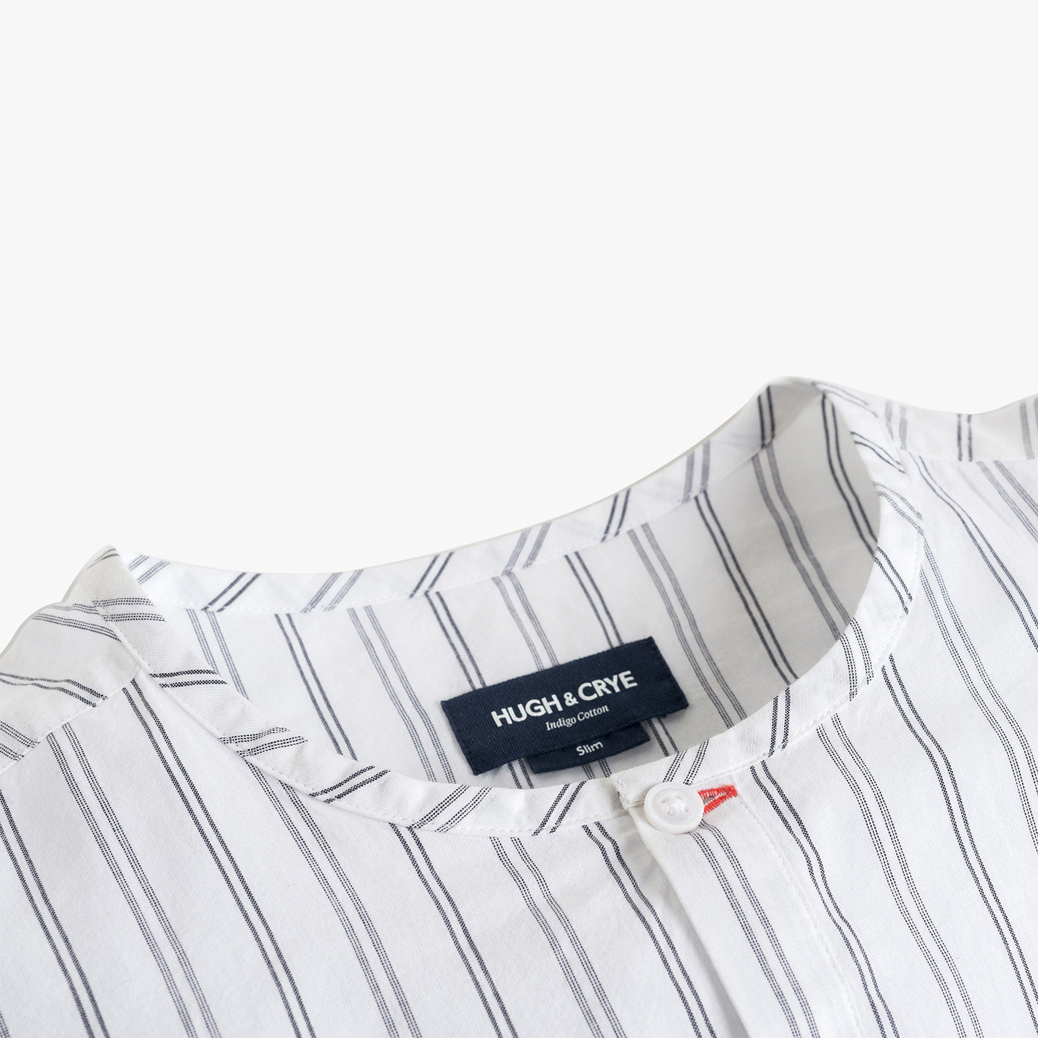 The Collarless Popover looks to remove the most defining part of a men’s dress shirt - the collar. What remains is a humble garment: part henley, part casual shirt. The Collarless Popover is cut from a high quality two-ply 120 lightweight indigo cotton, with a 3 button quarter placket, single breast pocket, cuff finished short-sleeves, and a split hem. The Collarless Popover is perfect for warm days, and for layering under other pieces on cooler nights.