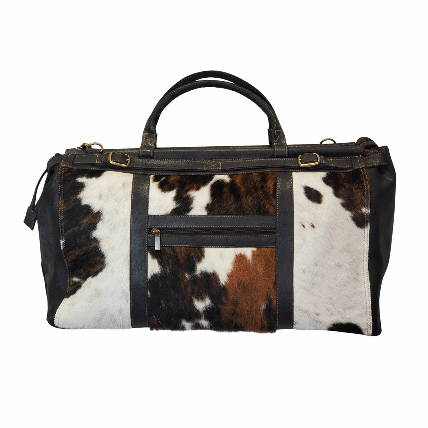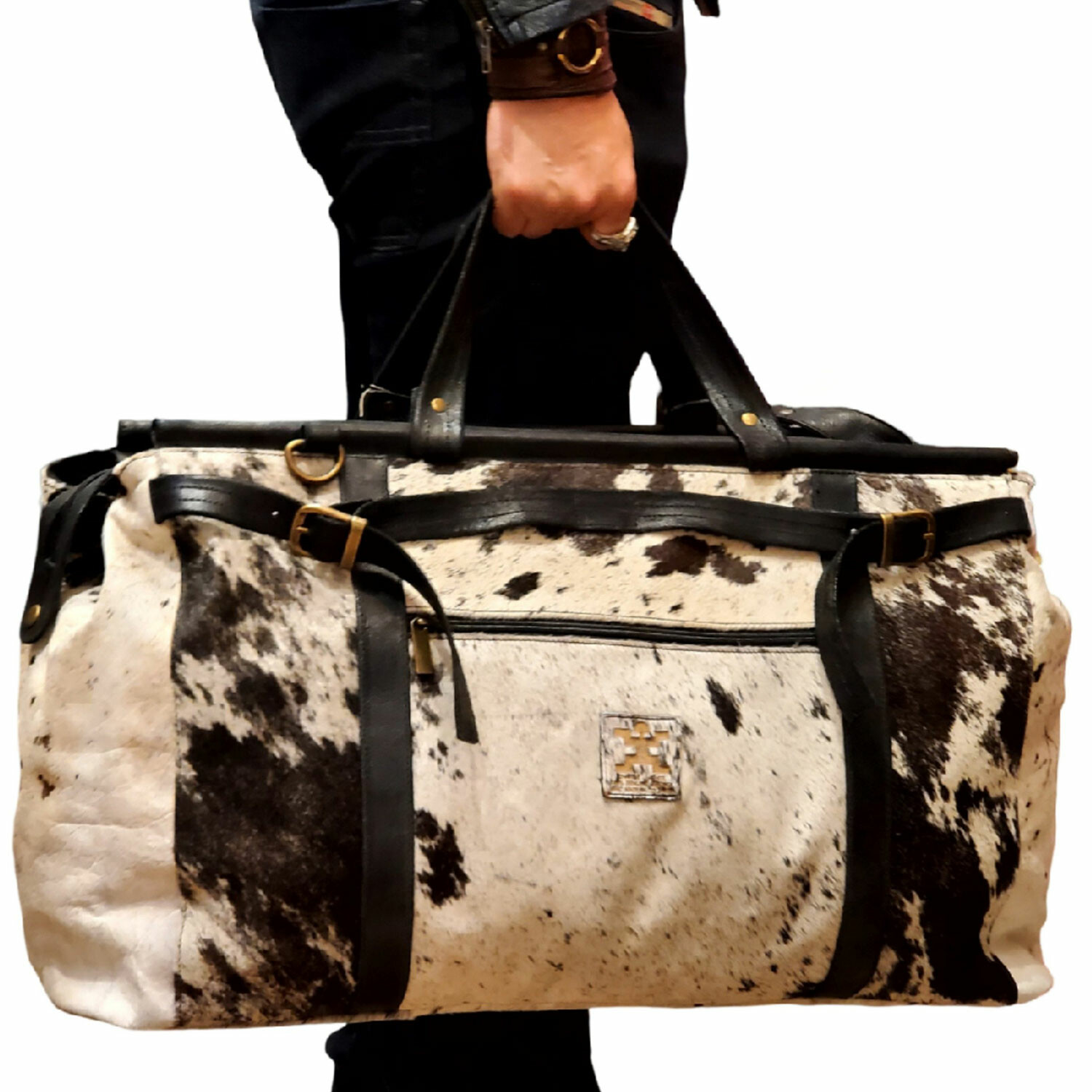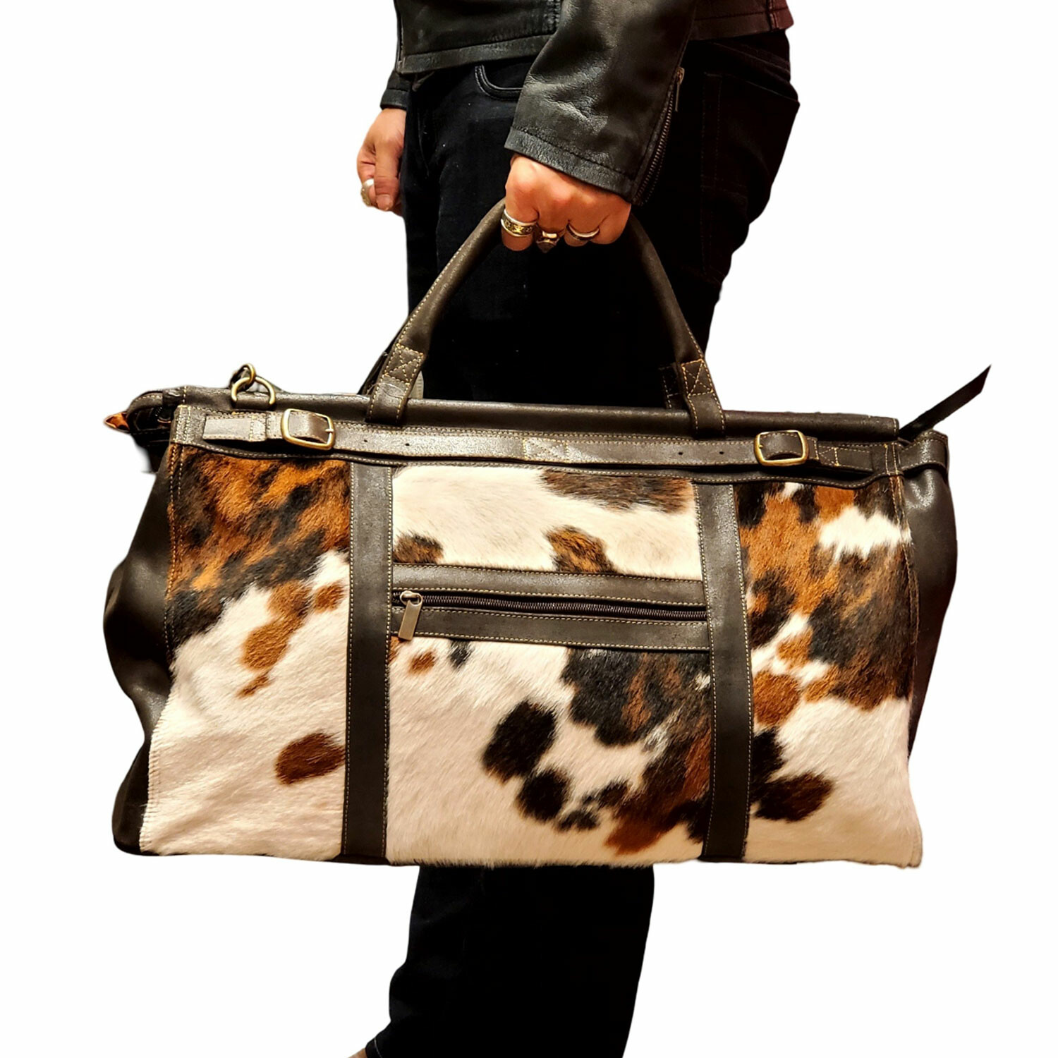 Crafted from genuine cowhide fur and natural leather, the Adelia Fur Extra Large Carry On combines bold style with functional design for travel or everyday use. Featuring a top dowel closure with zip and cinch belt strap, it includes a full-size back zipper and a pass-through sleeve that slips over rolling luggage handles. With an exterior zip pocket, adjustable shoulder strap, and sturdy metal feet, it's as practical as it is striking.