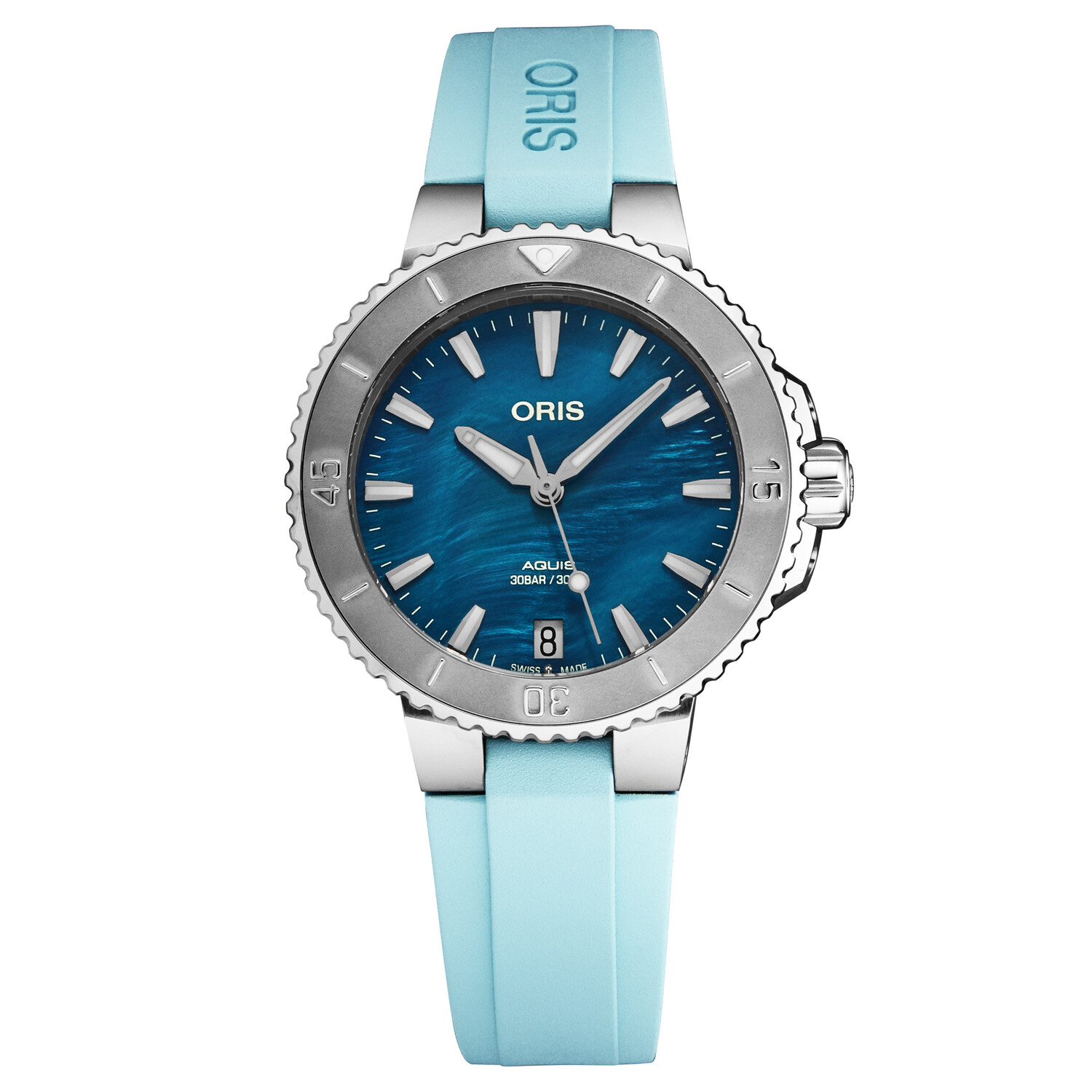 The Oris Aquis collection offers ladies' watches known for their sporty, diving-inspired design and robust construction. Key features include a unidirectional rotating bezel, luminous markers for visibility, and high water resistance (typically 300m).The Aquis collection is inspired by professional diving watches, featuring a unidirectional rotating bezel, luminous markers, and high water resistance.