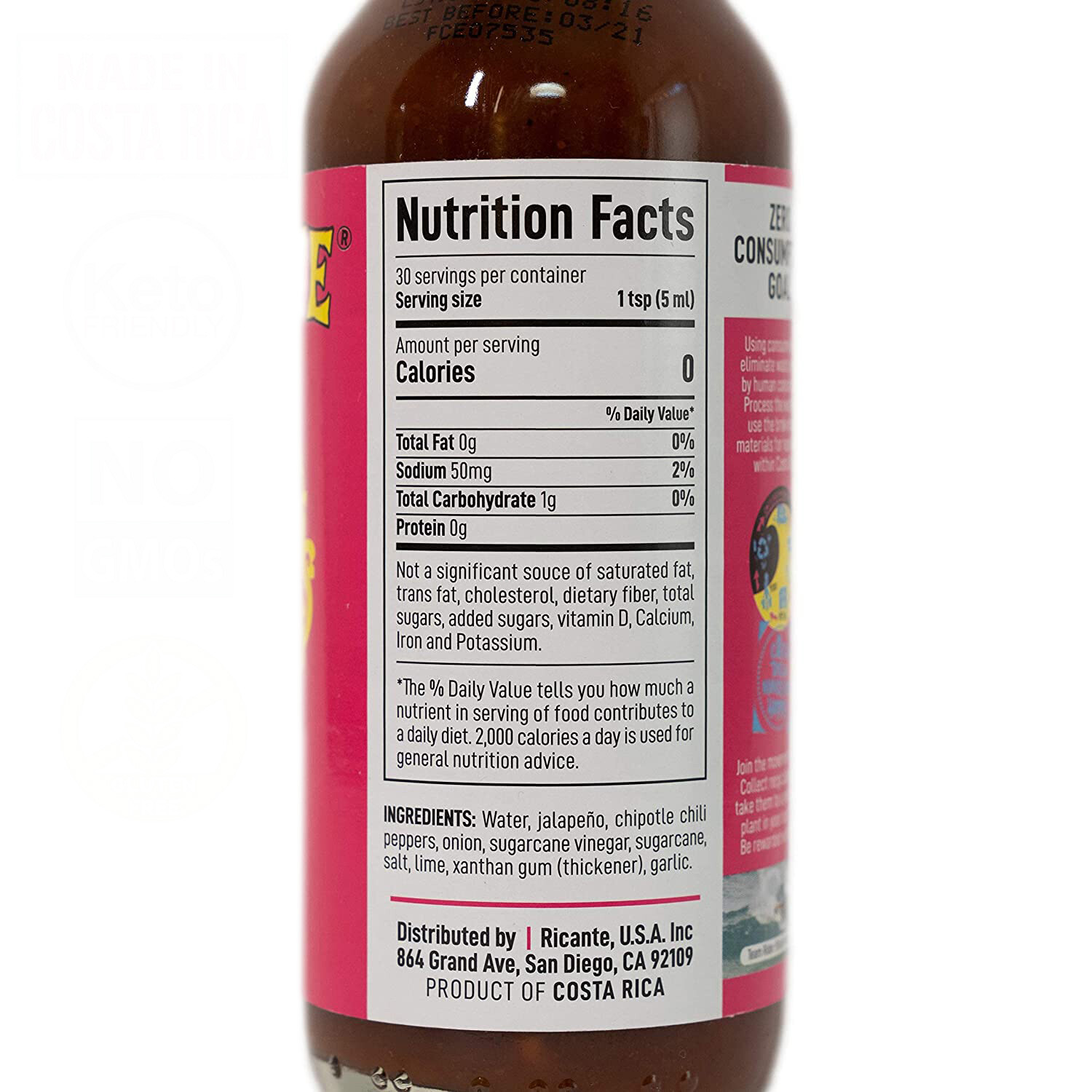 Ingredients: Water, Jalapeño, Chipotle Chili Peppers, Onion, Sugarcane Vinegar, Sugarcane, Salt, Xanthan Gum (Thickener), Garlic.