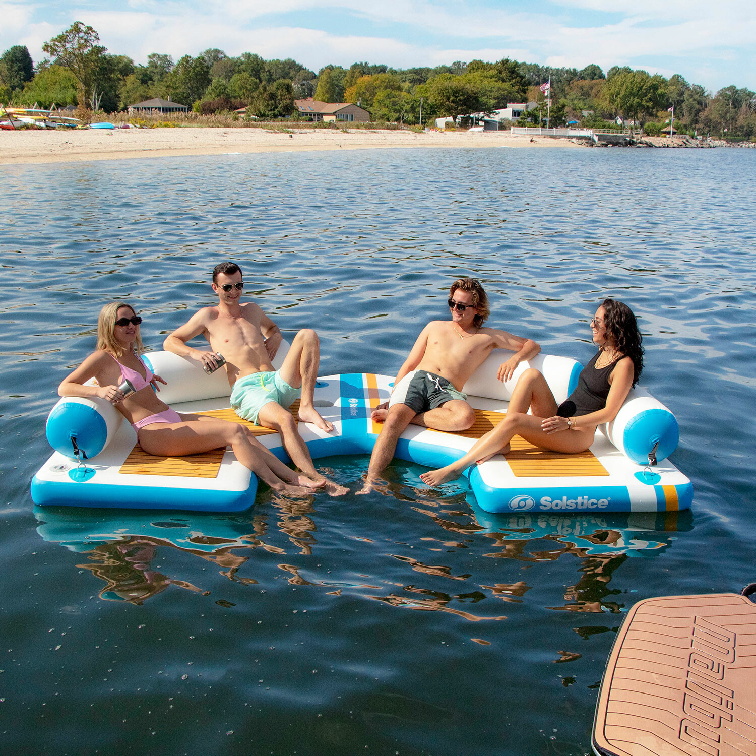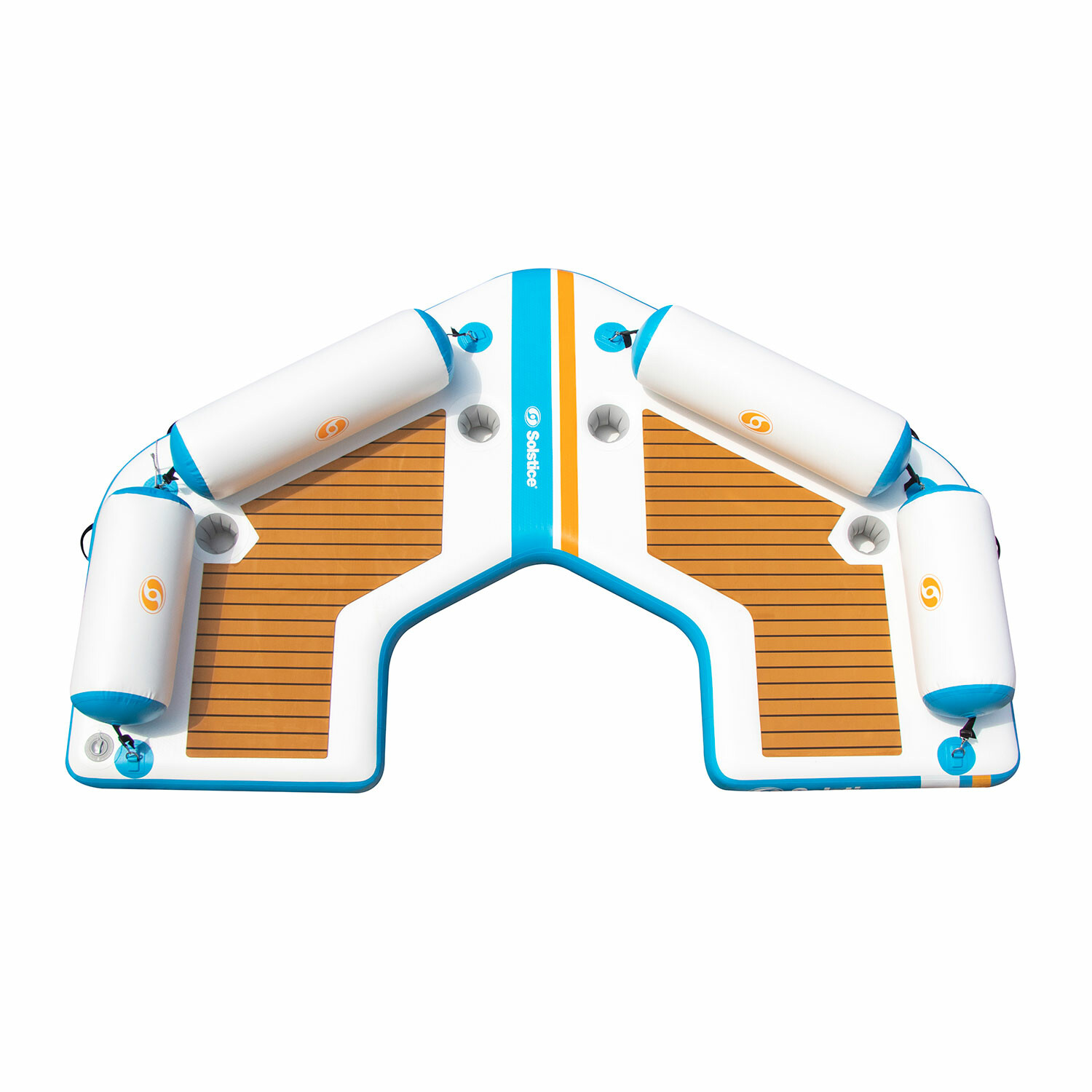 The Solstice Watersports inflatable C-shaped dock is constructed to comfortably fit up to 6 people with minimal tossing, turning, or tipping. The faux-wood traction pad offers an ultimate comfort seating area accompanied by 4 integrated cup holders. Equipped with 4 removable and adjustable backrest pillows for an enhanced lounging experience. The dock is constructed with an 8" core providing additional buoyancy and stability. Portable and compact when folded for easy storage.