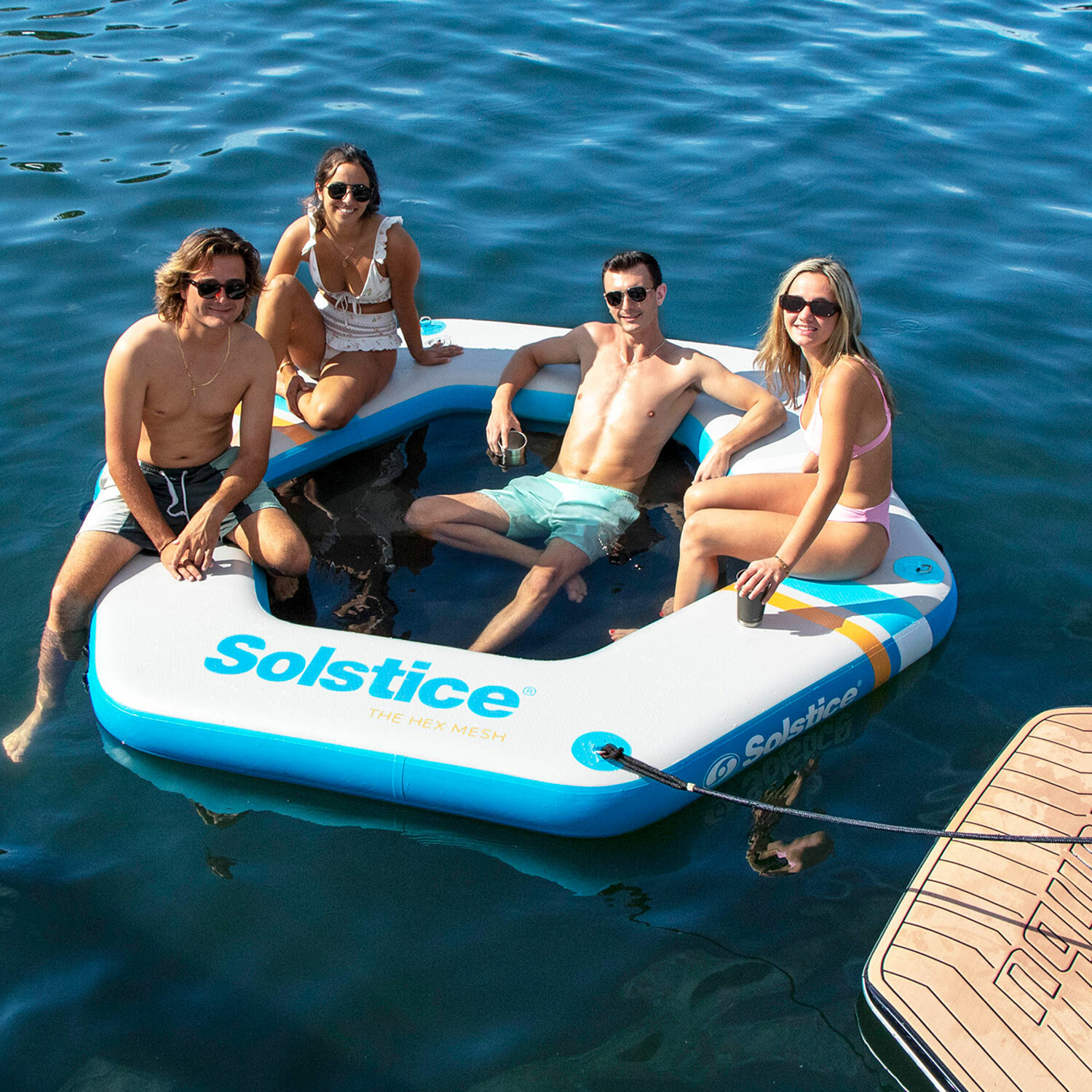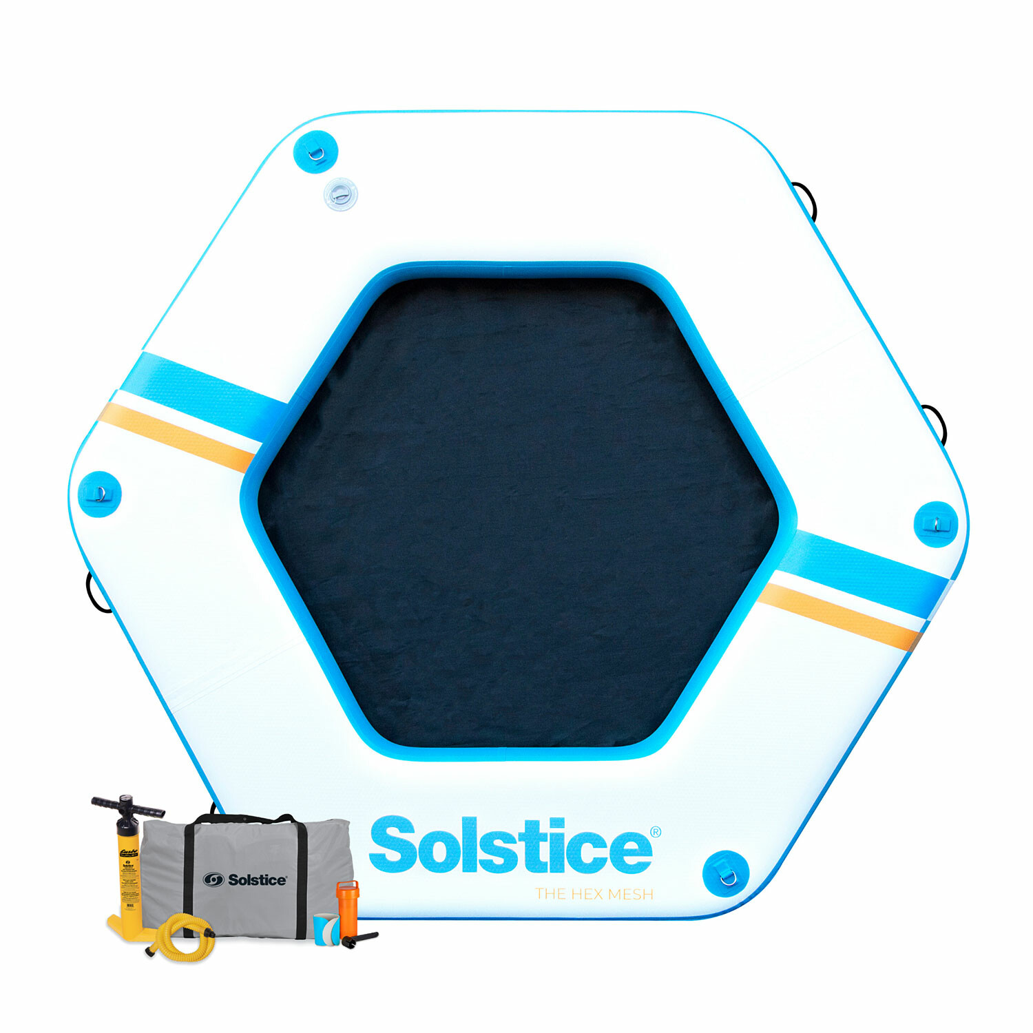 The Solstice Watersports Hex Mesh Dock measures 8'6" x 8'6" x 8" with a 5' center mesh hangout area. Utilize 20" of dock surround to relax, sun bathe, and hangout. Mesh center is removable. The dock offers 4 integrated grab handles and 4 D-rings. Constructed with an 8" core, it provides additional buoyancy and stability. Fits up to 6 people with minimal tossing, turning, or tipping. Folds easily for compact storage and portability.