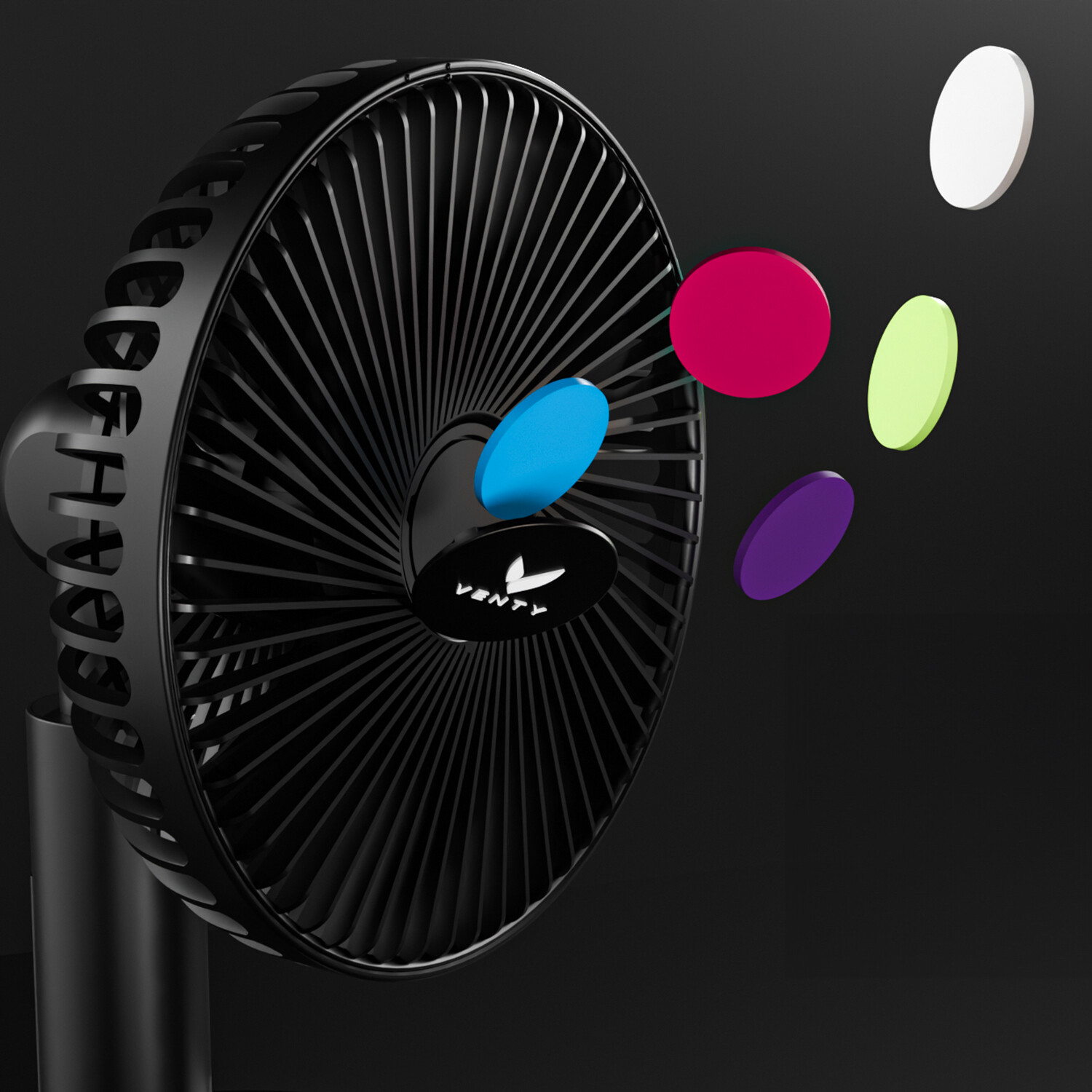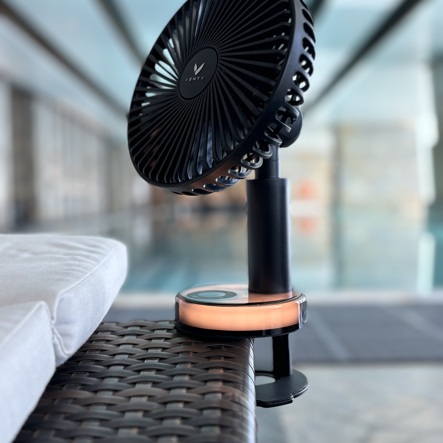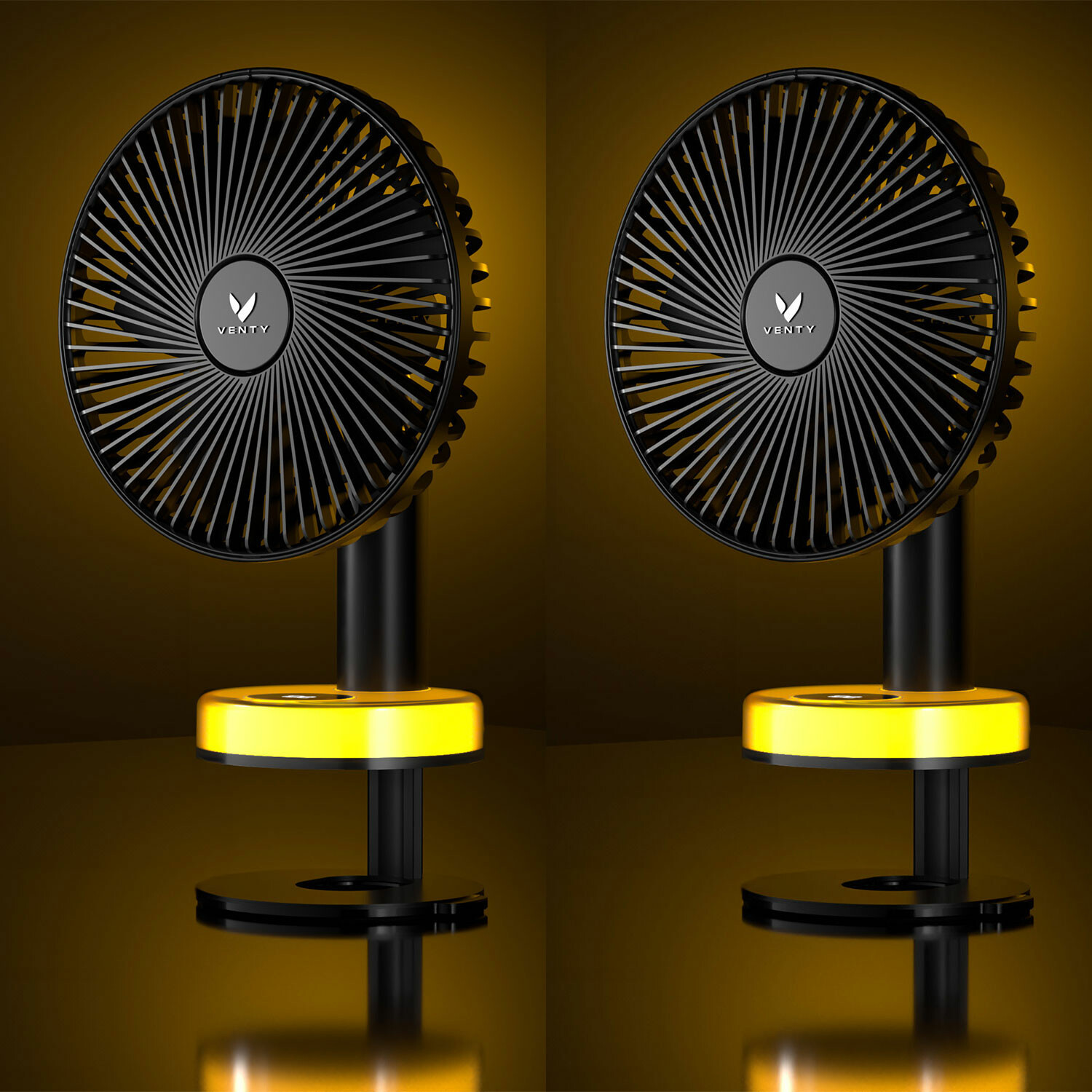 The Venty Clip Fan – Set of 2 delivers powerful, portable cooling with smart features and modern design. Each fan includes a sturdy aluminum clip with a padded, non-slip grip that attaches securely to desks, bed frames, and more. A built-in 5000 mAh rechargeable battery offers up to 10 hours of runtime, while the smart touch display gives you full control over fan speed, oscillation, and a patented LED light base with three ambient settings.