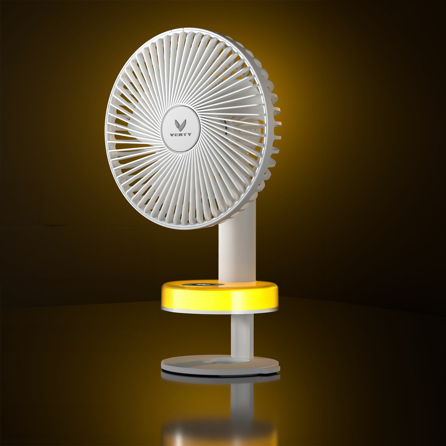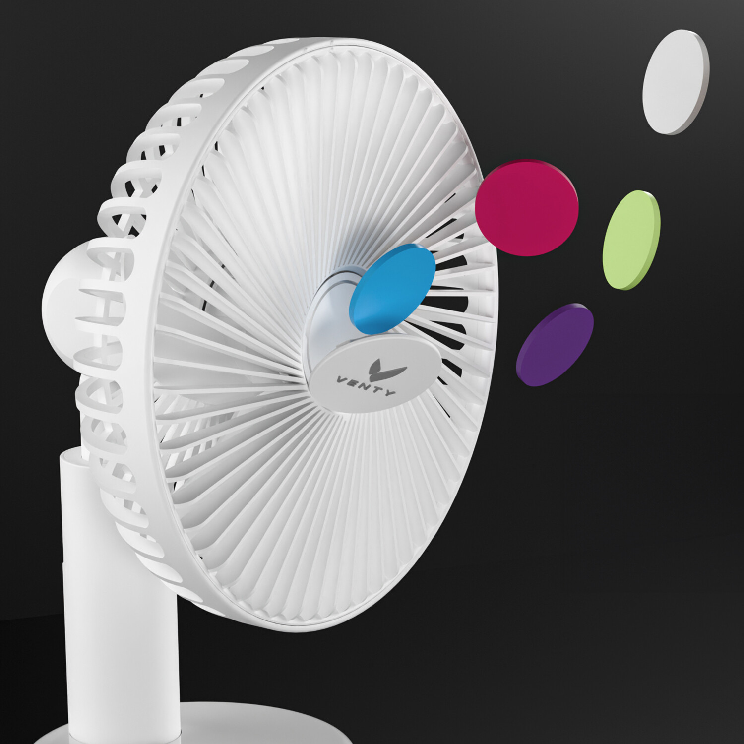 The Venty Clip Fan delivers powerful, portable cooling with smart features and modern design. Each fan includes a sturdy aluminum clip with a padded, non-slip grip that attaches securely to desks, bed frames, and more. A built-in 5000 mAh rechargeable battery offers up to 10 hours of runtime, while the smart touch display gives you full control over fan speed, oscillation, and a patented LED light base with three ambient settings.
